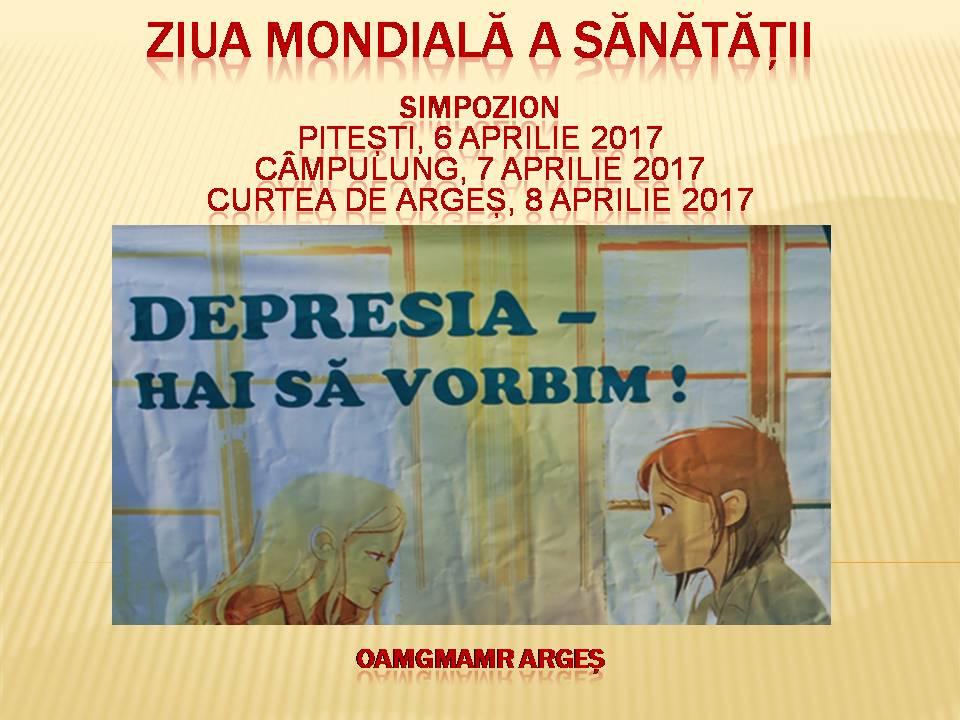 Promovând sloganul lansat de OMS, „DEPRESIA: HAI SĂ STĂM DE VORBĂ!”, Ordinul Asistenților Medicali Argeș a derulat la nivelul județului o amplă serie de manifestări științifice cu lucrări susținute de asistenți medicali și medici de specialitate, după următorul program: 06 Aprilie-ora 15.00, Pitești, Biblioteca Județeană  ”Dinicu Golescu”; 07 Aprilie-ora 15.00, Câmpulung, Primăria Municipiului Câmpulung; 08 Aprilie-ora 10.00, Curtea de Argeș.