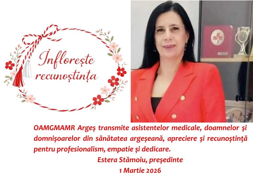 Distinselor asistente medicale, doamnelor și domnișoarelor din sistemul medical argeșean, le transmit cu inima deschisă, să le fie primăvara asemenea sufletului lor: delicată și puternică, blândă și neclintită, tăcută și plină de viață. Să poarte în pași curajul renașterii, în privire seninul cerului de martie, iar în inimă bucuria simplă a florilor care știu, an de an, să revină.