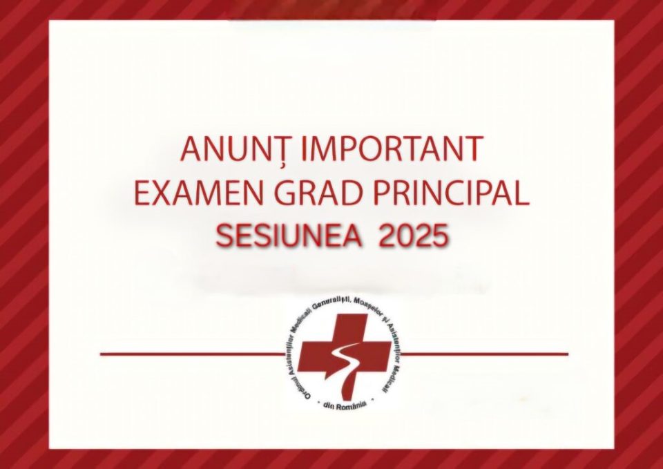 Ordinul Asistenților Medicali Generaliști, Moașelor și Asistenților Medicali din România (OAMGMAMR) organizează, prin filialele judeţene şi a municipiului Bucureşti, examenul de grad principal-sesiunea 2025, în conformitate cu prevederile Ordinului Ministrului Sănătăţii nr. 1137/06.09.2018 pentru aprobarea Metodologiei de organizare și desfășurare a examenului de grad principal pentru asistenți medicali generaliști, moașe, asistenți medicali, surori medicale și oficianți medicali, cu modificările și completările ulterioare.